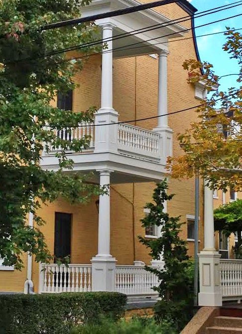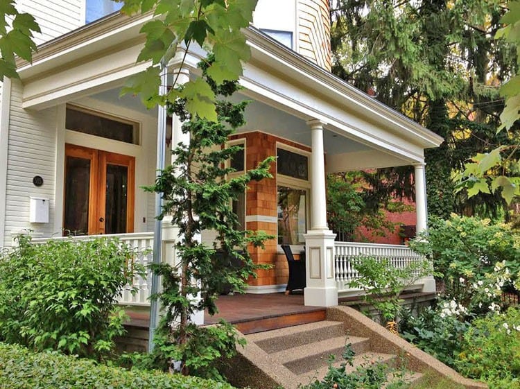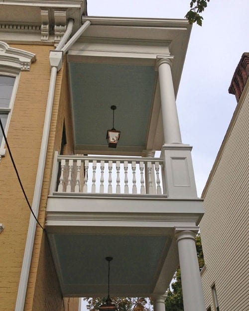 This homeowner wanted to keep the profile of their original porch railing. We reproduced the rail profile in cedar, with the slight modification of a sloped bottom rail and notched spindles to avoid problems with water sitting on the bottom rail.