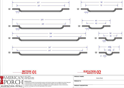 We offer gooseneck railings in our 4 1/2″ and 7 1/4″ Polyurethane Railings. These are a special order item. Simply email or call with your rail lengths and we’ll give you a quick quote.